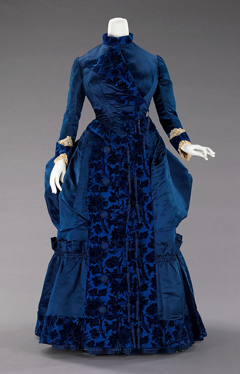 The bustle silhouette, although primarily associated with the second half of the 19th century, originated in earlier fashions as a simple bump at the back of the dress, such as with late 17th-early 18th century mantuas and late 18th- early 19th century Empire dresses. The full-blown bustle silhouette had its first Victorian appearance in the late 1860s, which started as fullness in skirts moving to the back of the dress. This fullness was drawn up in ties for walking that created a fashionable puff. This trendsetting puff expanded and was then built up with supports from a variety of different things such as horsehair, metal hoops and down. Styles of this period were often taken from historical inspiration and covered in various types of trim and lace. Accessories were petite and allowed for the focus on the large elaborate gowns. Around 1874, the style altered and the skirts began to hug the thighs in the front while the bustle at the back was reduced to a natural flow from the waist to the train. This period was marked by darker colors, asymmetrical drapery, oversize accessories and elongated forms created by full-length coats. Near the beginning of the 1880s the trends altered once again to include the bustle, this time it would reach its maximum potential with some skirts having the appearance of a full shelf at the back. The dense textiles preferred were covered in trimming, beadwork, puffs and bows to visually elevate them further. The feminine silhouette continued like this through 1889 before the skirts began to reduce and make way for the S-curve silhouette.