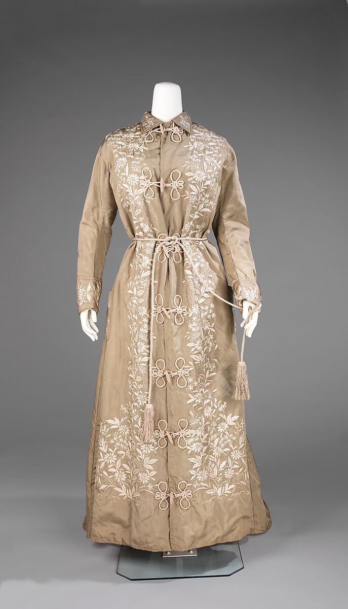 Known as Yokohama robes for the Japanese port from which they were exported, this type of embroidered informal gown was one of the first items to be exported after Japan was opened to the West in 1854. The Yokohama port was then opened in 1859. The robes were sought after by women of economic means for their beauty, warmth, light weight and sense of exoticism. While the embroidery motifs on Yokohama robes, such as the swallows and floral tendrils on the pockets in this example, are very much in the Japanese taste, the cut of the garment is in the Western style, bearing no relation to native Japanese dress.