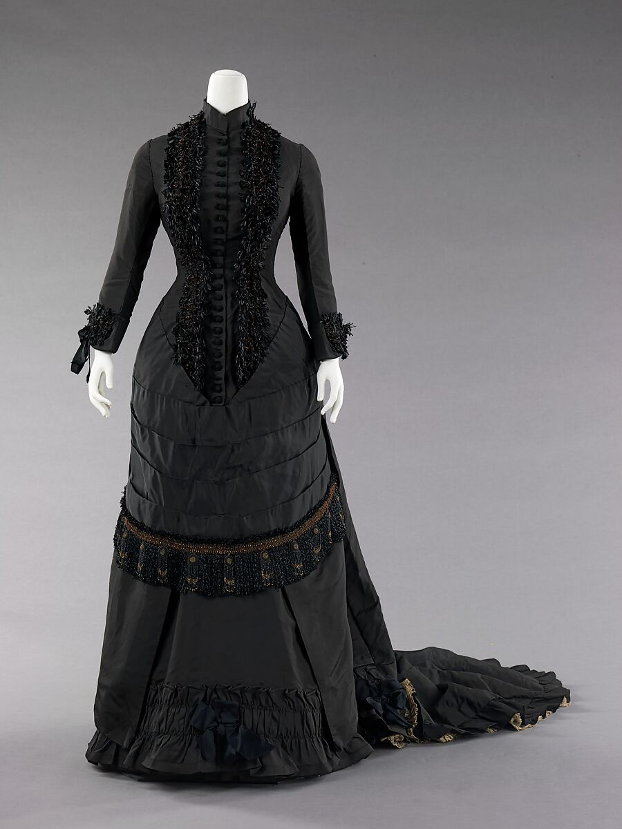 The bustle silhouette, although primarily associated with the second half of the 19th century, originated in earlier fashions as a simple bump at the back of the dress, such as with late 17th-early 18th century mantuas and late 18th- early 19th century Empire dresses. The full-blown bustle silhouette had its first Victorian appearance in the late 1860s, which started as fullness in skirts moving to the back of the dress. This fullness was drawn up in ties for walking that created a fashionable puff. This trendsetting puff expanded and was then built up with supports from a variety of different things such as horsehair, metal hoops and down. Styles of this period were often taken from historical inspiration and covered in various types of trim and lace. Accessories were petite and allowed for the focus on the large elaborate gowns. Around 1874, the style altered and the skirts began to hug the thighs in the front while the bustle at the back was reduced to a natural flow from the waist to the train. This period was marked by darker colors, asymmetrical drapery, oversize accessories and elongated forms created by full-length coats. Near the beginning of the 1880s the trends altered once again to include the bustle, this time it would reach its maximum potential with some skirts having the appearance of a full shelf at the back. The dense textiles preferred were covered in trimming, beadwork, puffs and bows to visually elevate them further. The feminine silhouette continued like this through 1889 before the skirts began to reduce and make way for the S-curve silhouette.