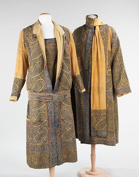 This ensemble, along with 2009.300.3767a, b, exemplify the ongoing fascination with paisley shawls and the practice of making clothing from them that endured into 20th century. This three-piece ensemble, made from a cashmere shawl, features the classic 1920s silhouette and is especially notable for its completeness.