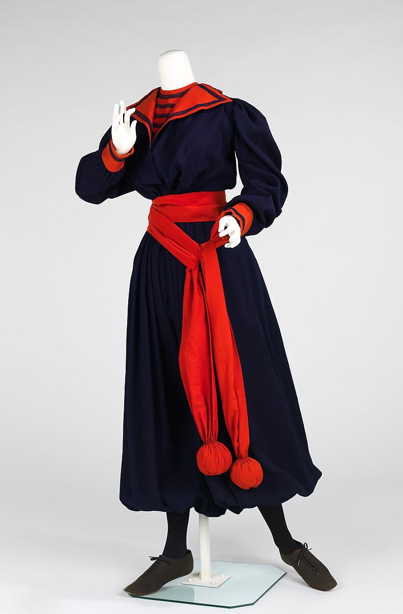 This ensemble is exemplary of the typical garment created by women participating in a physical education course in the late 19th century. The middy style blouse and bloomers allowed movement and fully concealed the female figure, while the balls on the end of the sash could be used as props in calisthenics. Its striking trim, nautical sensibility and unique sash make it an intriguing peek into the early gymnasium of women.
