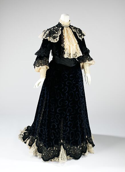 Worn by a lady of society during her afternoon calls, this dress is an excellent representation of the complexity of surface decoration and lace treatment which are quintessential Belle Époque devices denoting opulence and luxury. The treatment of the velvet is exemplary, for such an advanced technique as impressed velvet would only be available to French couture houses. The jacket and bodice are quite becoming, as the blousing of the underbodice creates a bolero effect which was a prevalent style during this period.