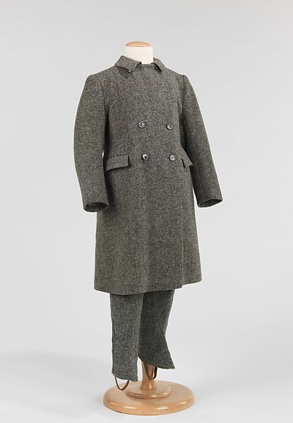 Worn by the well-dressed young girl, Beaufort S. Bodman, of which the Brooklyn Museum Collection has several pieces, this is an excellent example of a high quality child's snowsuit. A very sporty style, it was made in England and then likely sold at a high end Madison Avenue retailer. Eventually, the snowsuit would transition into a one-piece style, this being the precursor of this necessary winter garb.
