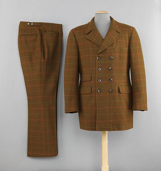 This suit typifies the experimentation in men's fashion by the late 1960s. Although it is a casual suit, the exaggerated length of the jacket makes it a high-style piece. The turned-down points contrast with the more typical turned-up points and the scribble-patterned silk lining contribute to the overall dandy appearance.