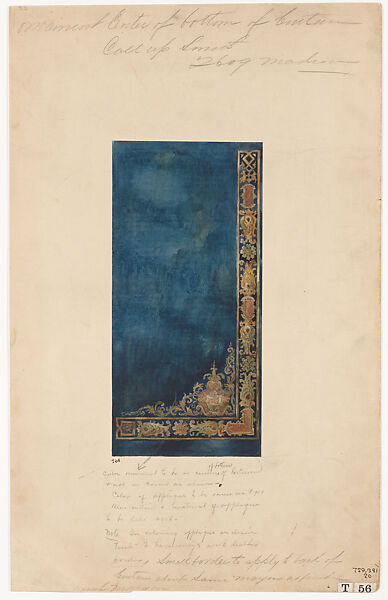 This design for a portiere, or doorway curtain, features a deep blue ground enlivened with gold, red, and green Renaissance-style embroidery. While textiles were important elements of Tiffany's interior designs, they rarely survive intact, which makes such design drawings all the more important. Editorial remarks in graphite in the bottom margin, made by either Tiffany or the client, give a wonderful insight into how Tiffany's designs evolved from sketch to finished product: "Curtain ornament to be in center of bottom of portier and not in corner as shown."