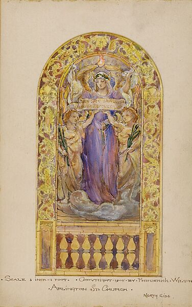This highly finished presentation drawing is for one of six figural windows depicting the beatitudes in the balcony of the Arlington Street Church in Boston. Wilson originally created ten window designs representing the blessings by Christ in the Sermon on the Mount (Matthew 5:1–12), six of which were executed in glass. It is likely that this drawing was formally presented to the Arlington Street Church—it is mounted in a green cloth-covered portfolio with the Tiffany Studios’s monogram on the cover. Several years earlier, Wilson designed a different beatitude window for Calvary Church in Summit, New Jersey. A critic from the New York Times praised Wilson’s success in translating “purely abstract definitions of principles…into the language of the illustrator.”
