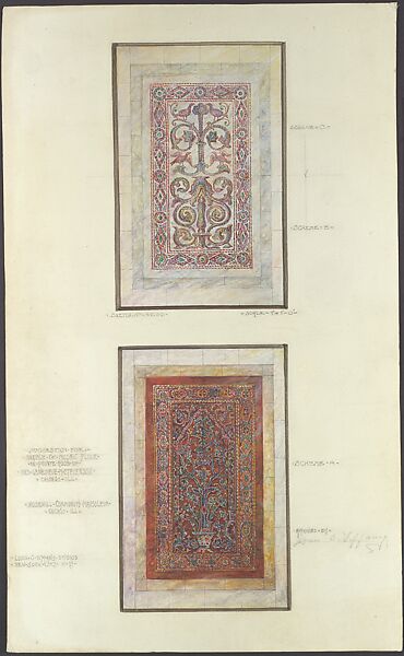This drawing includes three suggestions for a marble and mosaic floor for the private room of Mrs. Genevieve M. Stevenson (ca. 1875–1941) in the Rosehill Community Mausoleum in Chicago. Tiffany was strongly inspired by Islamic decorative elements and symbolism in these designs. In Islamic art, paradise is depicted as a walled garden sheltered under an arched gateway—the entrance to heaven. The arch seen in Scheme A represents either this gateway or a mihrab, a prayer niche used in mosques and represented frequently on prayer rugs, which inspired this drawing. The tree and its branches represent the stages of the soul’s ascent to heaven, while birds act as the soul’s guides, connecting earth and heaven through flight.