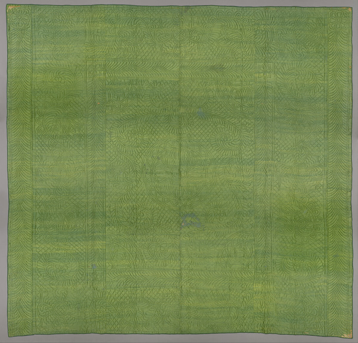 Even in the mid-eighteenth century, this was a special quilt. Silk quilts were not generally intended for everyday use, and were likely owned by elite families. The delicate quilt has a plain-weave green silk top and a wool back that has been "calendered" (or pressed) with a large-scale pattern of flowers and foliage, reminiscent of the patterns woven into the famous English-made Spitalfields silks of the same period. It is stuffed with a layer of wool and has been quilted with green silk thread in intricate designs centering on a circular medallion.