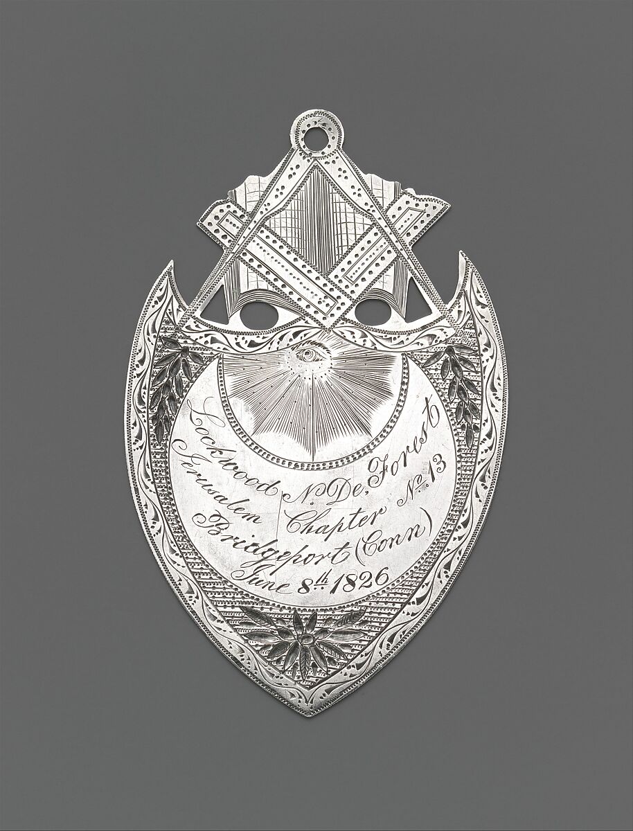 Fraternal societies of freemasons, first introduced into the American colonies around 1730, became increasingly popular following the Revolutionary War. The enthusiasm for Freemasonry went hand in hand with a growing interest in the Enlightenment and with ideals of equality. Having developed originally out of craft guilds, Freemasonry often adopted symbols of the crafts—for instance the architect's square as a symbol of virtue—as well as religious and heraldic devices. Jewelry formed an important part of the regalia. This shield-shaped silver medal was made as a personal jewel for Lockwood N. DeForest, a member of Jerusalem Chapter No. 13 of Bridgeport, Connecticut. It is engraved with various masonic devices and scripts, as well as with DeForest's own emblem of a three-masted schooner flying a pennant and the American flag and the date June 8, 1826. The signature of the engraver, C. Foote, appears below the sailing ship.