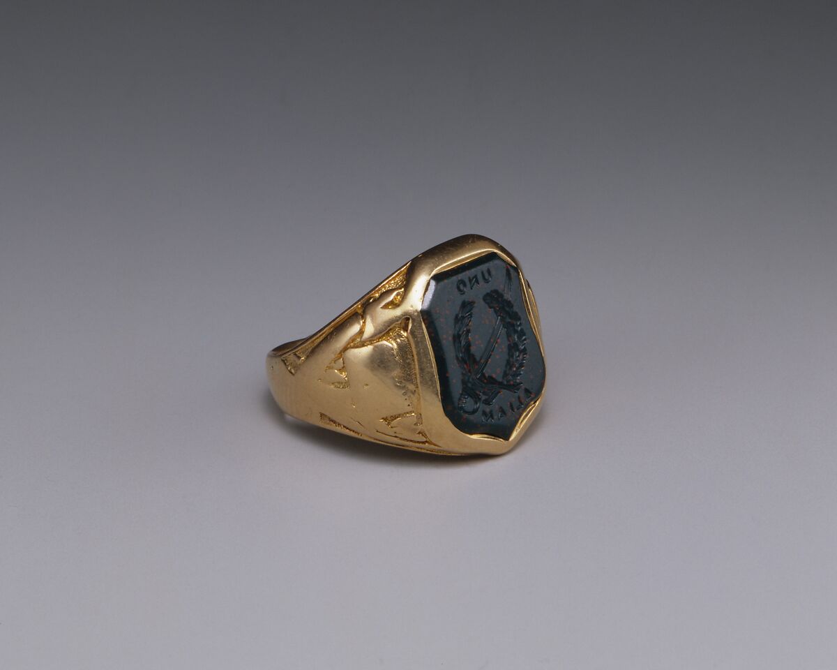 This class ring was made by prominent New York City jewelers, Ball, Black & Co., and was acquired by John K. Elliott upon his graduation from the United States Military Academy in 1864. The shield-shaped bloodstone intaglio features a crossed laurel wreath and sword, and the chosen motto of the class of 1864, “Uno Aliam.” The design and motto are engraved in reverse, allowing the gem to function as a seal. The shoulders of the ring, which are worn from use, feature military trophies. The inside of the ring is engraved “John K. Elliott Graduating Class 1864.” Following his graduation, Pennsylvanian John K. Elliot fought in the Civil War. He was severely wounded and died from complications of his injury on April 18th, 1871 at the age of 29.