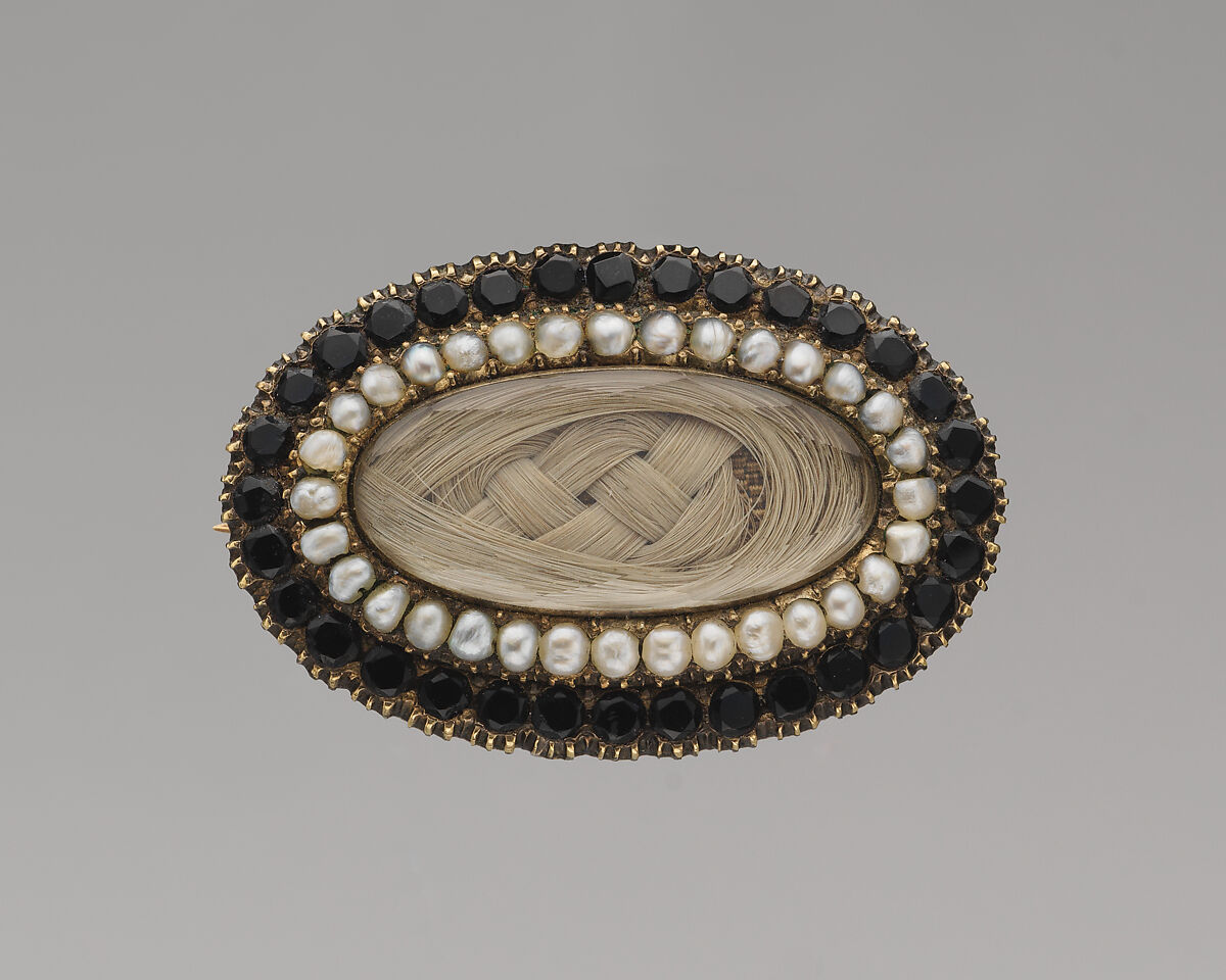 During the second half of the eighteenth century, jewelers and miniaturists began to weave or plait human hair for mounting into brooches, lockets, bracelets, and rings or to be inserted into the back of framed miniatures. As a reminder of a loved one, whether living or deceased, hair was a durable material that could be treated in a decorative manner. Engraved inscriptions often indicate whether the piece was intended as mourning jewelry or as a token of love. By the mid-nineteenth century, hair was also being woven into three-dimensional forms for mounting as earrings, charms, or watch chains.