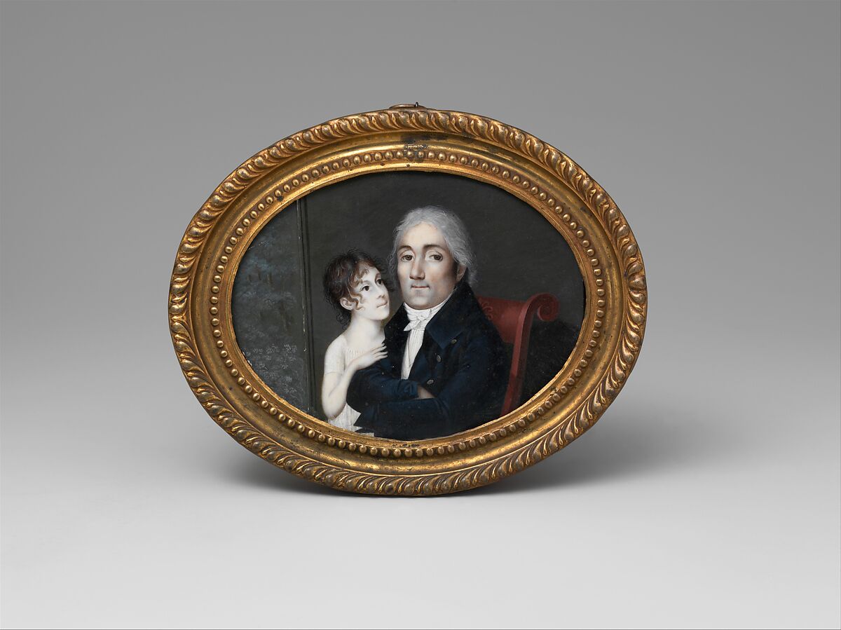 Guyol de Guiran is known exclusively by this signed work of striking quality and originality. The artist was one of the many French-émigré miniaturists who came to America in the early nineteenth century, when the market was especially strong for such delicate likenesses. The Museum's collection of works by these painters is extensive and greatly enhanced by this touchstone portrait. Guyol de Guiran worked in St. Louis (1812–ca. 1820) and in New Orleans (1822–28); this picture may have been made in either locale. It is presumably a portrayal of a father and daughter, given the age difference and the loving glance from the girl to her gentleman companion. An unusual feature of the tiny painting is the artist's joining of supports—the figures being painted on ivory, and the foliage on paper.