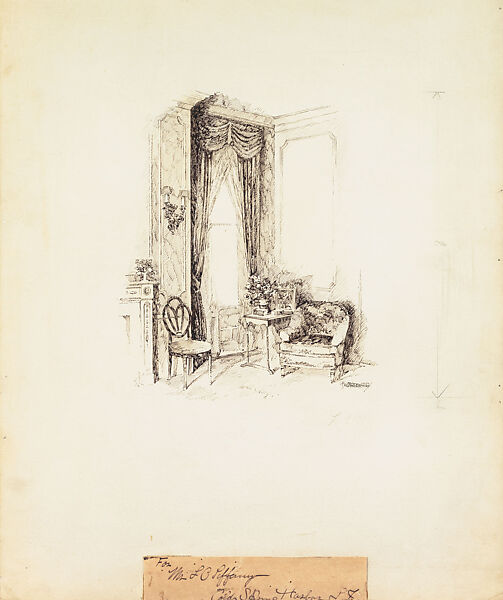 Although this drawing was found with the group of Tiffany Studios drawings acquired by the Museum in 1953, it is stylistically different from its counterparts. In addition, an unknown hand crossed out "F. V. CARPENTER" and penciled in "LCT." This appears to be an inaccurate alteration, particularly because an inscription at the bottom of the page reads: "For Mr. L. C. Tiffany / Cold Spring Harbor, LI." The connection between Frederich V. Carpenter (1892-?), an artist and illustrator, and Louis Comfort Tiffany is unknown, but the drawing may relate to houses Tiffany built for his children on his Laurelton Hall estate. The chair and mantel reference eighteenth-century British designers whose publications were extremely popular in post-Revolutionary America.