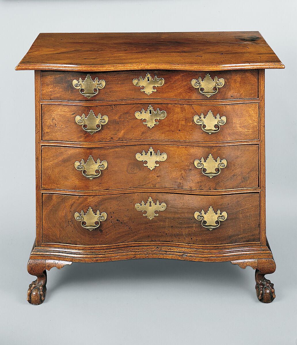 This deceptively simple chest is an excellent example of a common form. The shapes and proportions are in harmony, the wood is the best mahogany, and the brasses are big and bold. Every part is original, and the piece retains its old surface, with a warm, golden brown patina. The graceful, serpentine front and crisply curved brackets of the feet reflect the lightness and playfulness of the Rococo.