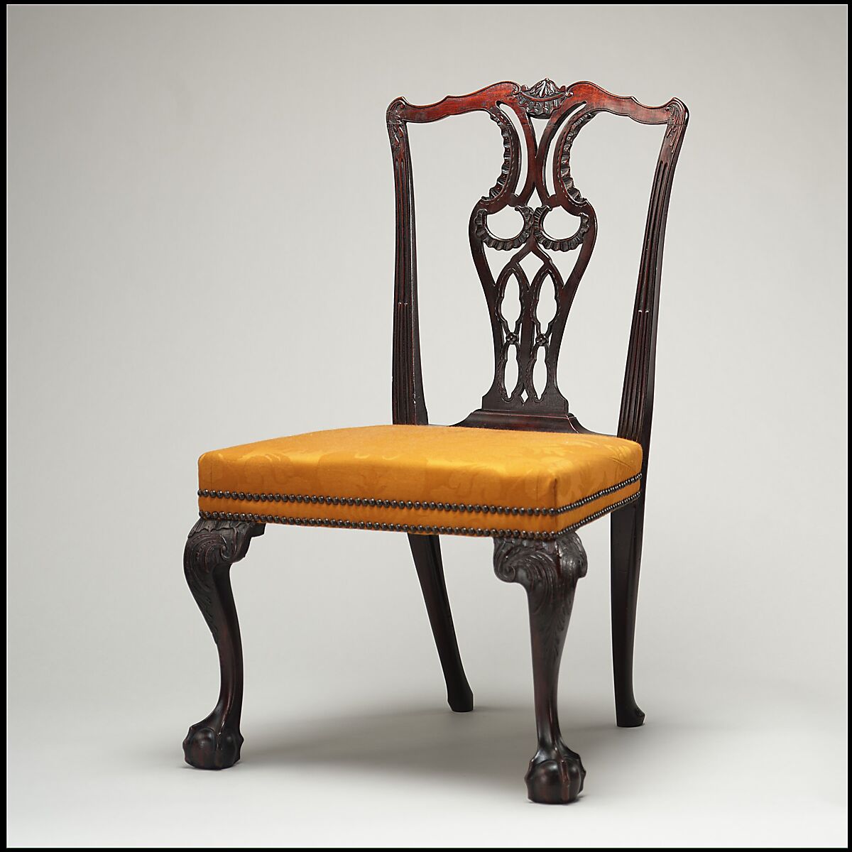 This richly carved Gothic-splat New York chair is part of a set or sets of chairs that descended in the Verplanck family of New York. In addition, the museum owns an armchair and six other side chairs (see 40.137.2; 62.250.1–.3; 63.22.1-.2; 1984.287 for set). All of the chairs exhibit close similarities and may have been made in one shop, although close examination reveals splats from two different templates, carving by two different hands, and the incised marks of two separate sets. The carving of crest rail and splat on this chair matches that on the armchair and four of the side chairs (1984.287, 62.250.1–.3, and 63.22.1). The seat has been reupholstered in a reproduction of fabric that descended in the Verplanck family.