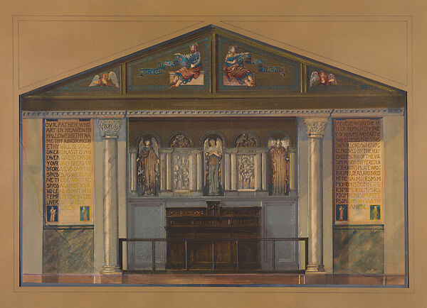 The triangular pediment is decorated with mosaic, which Tiffany endorsed for its associations with works from antiquity such as the floors at Pompeii and early Christian murals outside Rome. The artist finished the mosaic in this drawing with metallic inks and fine flecks of gouache, suggesting the glittering effect of Favrile glass tesserae. The panels flanking the altar bear the incomplete texts of the Lord’s Prayer and the Apostle’s Creed, filled in with unintelligible lettering as on the banners above, suggesting possible inscriptions.