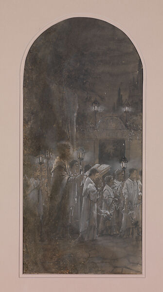 The Museum owns four drawings related to the monumental mosaic triptych "Te Deum Laudamus" made for the First Methodist Episcopal Church of Los Angeles in 1922. The mosaics are currently installed at the Lake Merritt United Methodist Church in Oakland, California. This drawing represents the left panel of the tryptich in which a procession of singing youths is led by a man who represents the bishops of the church. This drawing is an early version of the design rendered without color and lacking individual tesserae. It successfully conveys the overall composition, figures, and atmospherics of the mosaic. Certain details, however, such as the architectural structures in the background, remain sketchy.