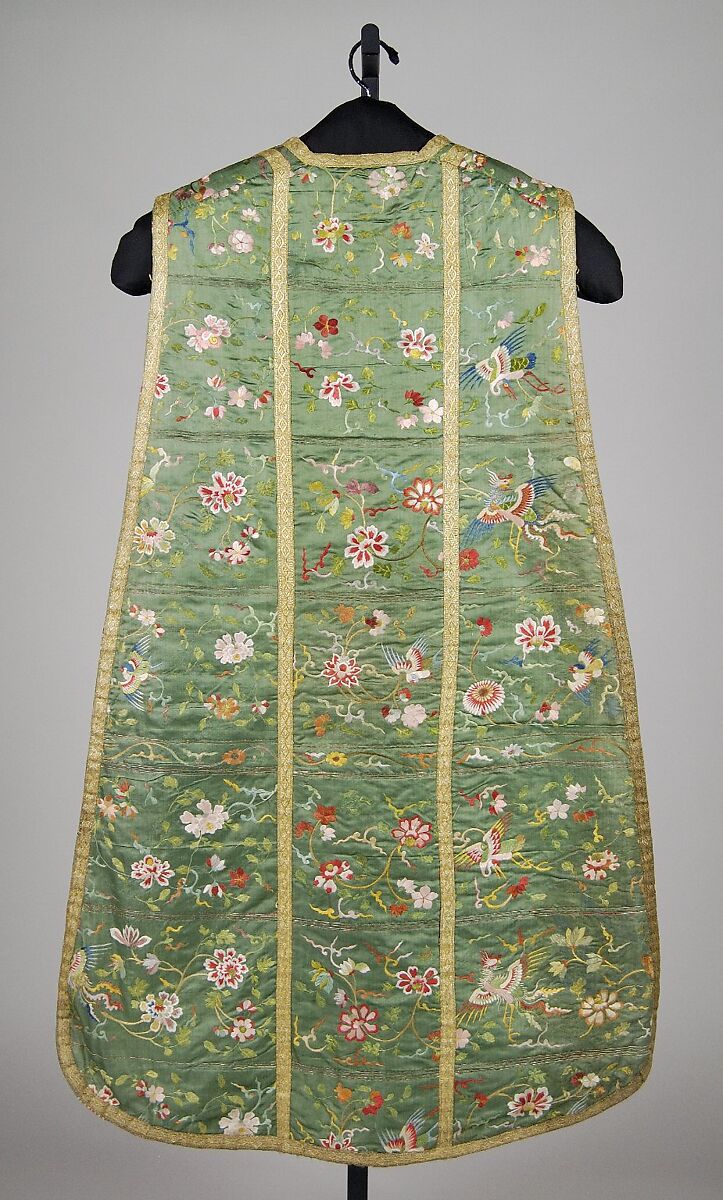 This chasuble- the garment worn, tabard-style, by a Catholic priest during church services- is a modest example of modern production.