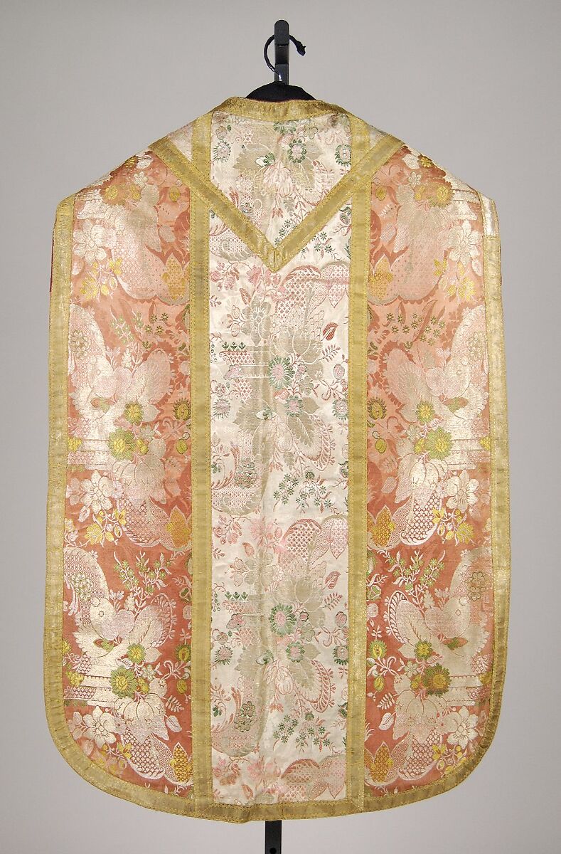 This Chasuble- the tabard-like garment worn by a Roman Catholic priest over his clothes when conducting church services- is distinguished by its panels of very beautiful and well-preserved "bizarre" silk. This short-lived style of figurative silk, woven in France, Italy and England, inventively juxtaposed floral and nautical motifs in varying scales, emulating the decorative fabrics imported to Europe from Iran and India. Though the front of the chasuble has been awkwardly cut, patched and reshaped in the nineteenth century to meet modern fashions, the back of the garment preserves the original shape. In the central panel on the Chasuble's back, the same silk is shown in reverse, thereby flipping the palette from white elements on a coral ground to coral on a white ground.