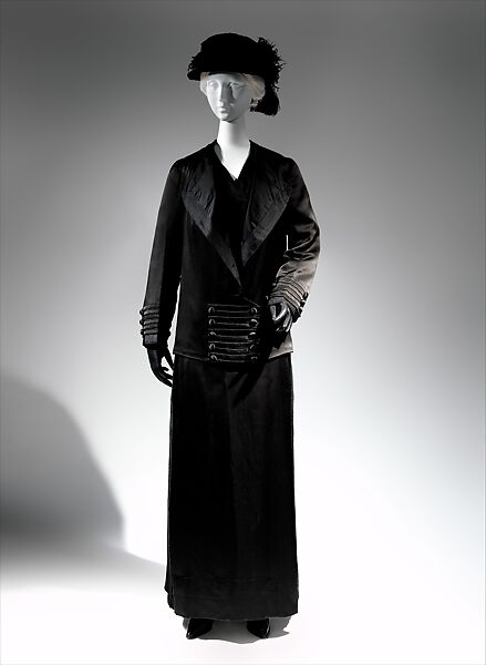 This walking suit, createdy by the British designer Lucile (Lady Duff Gordon), is thought to have been worn by Mrs. Frederick H. Prince (1860–1949), a prominent member of New York and Newport society. Mrs. Prince lost her mother in 1915 and her son Norman the following year, when he died from injuries sustained as a volunteer aviator during World War I.