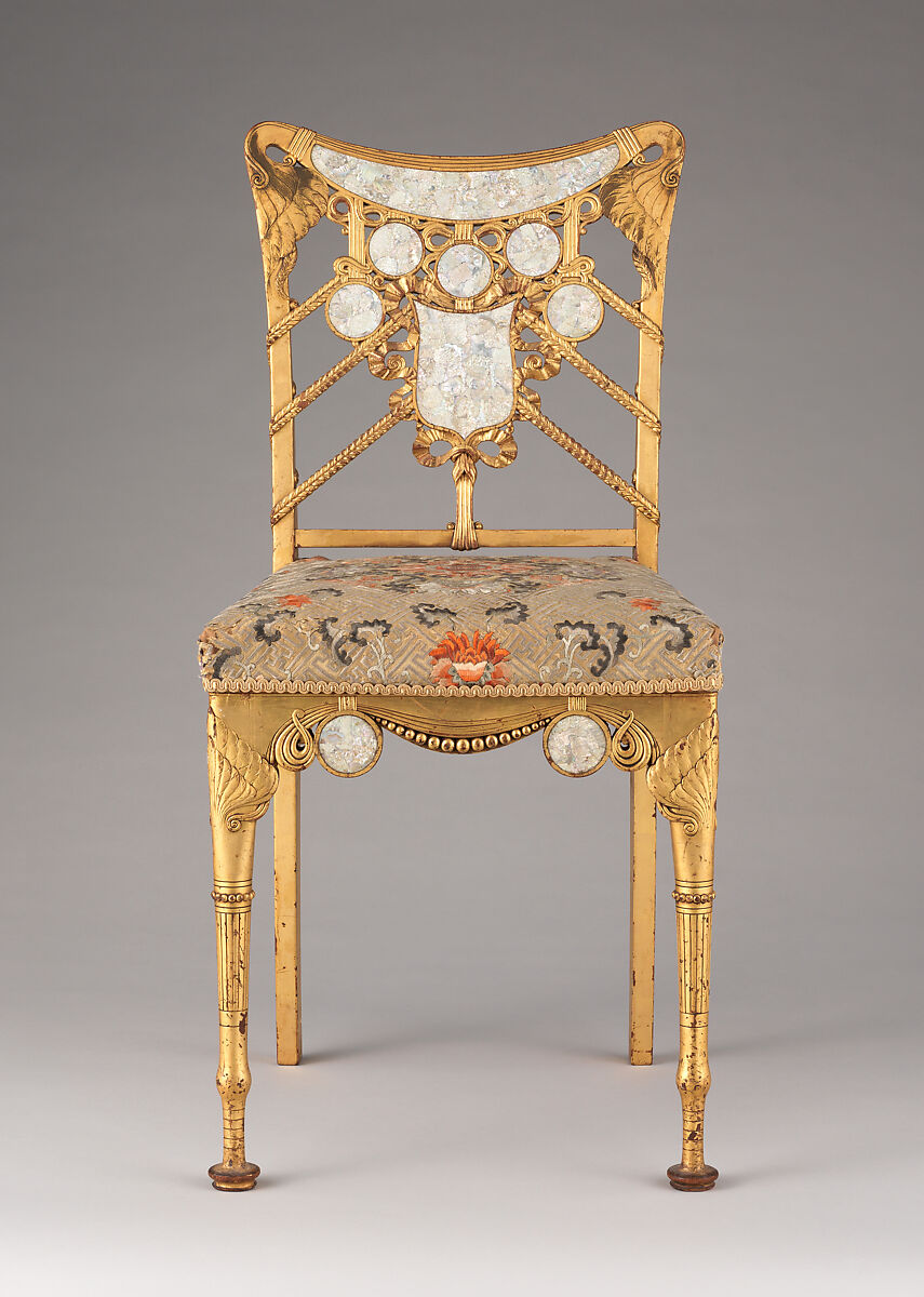 - Medium: Gilded maple, inlaid with mother-of-pearl, and modern upholstery