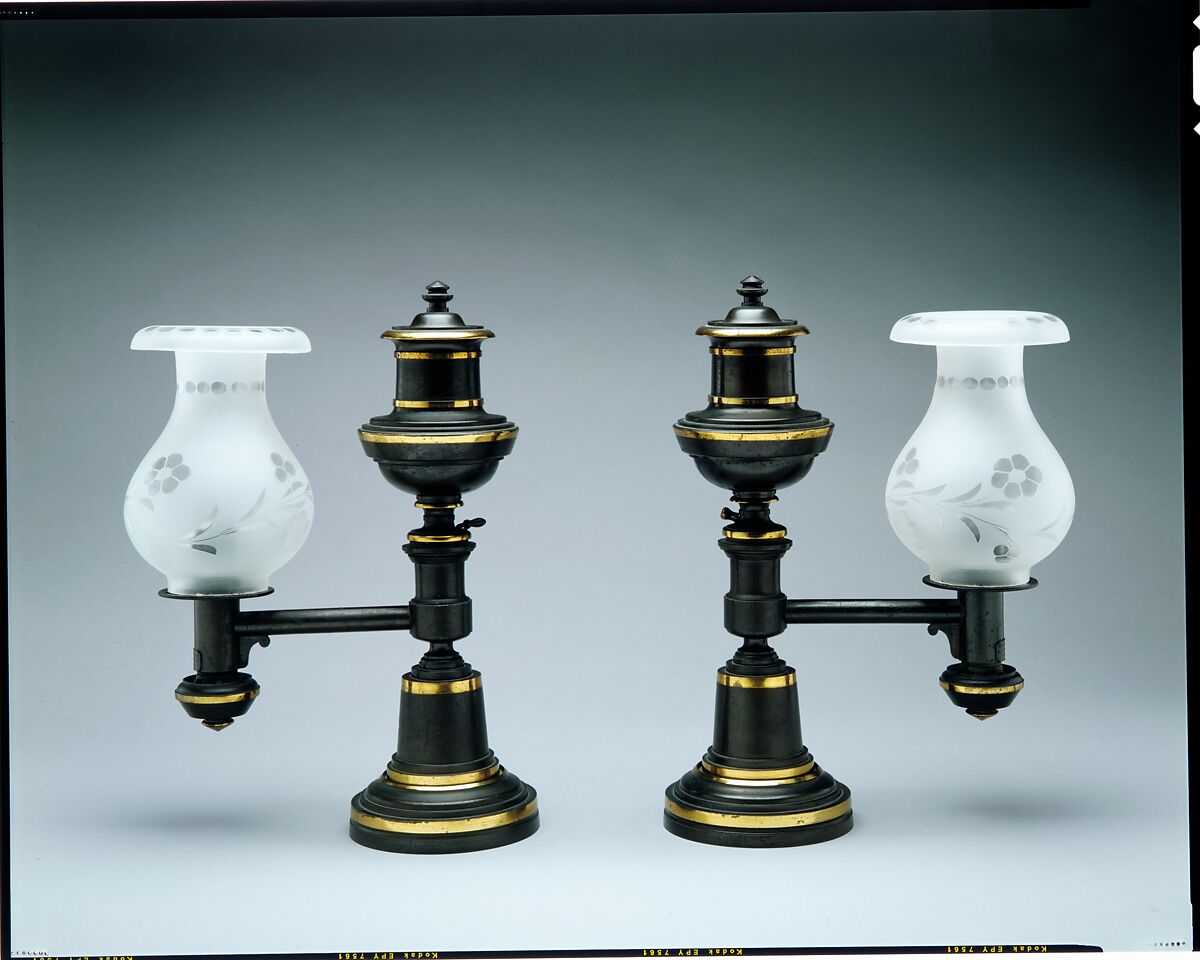 These lamps (see also 2002.391.2a--e) are early examples of the work of Henry N. Hooper and Company, a leading purveyor of lighting fixtures in mid-nineteenth-century Boston. The lamps are rare in retaining their original surface. Their simple, architectural design relates to the abstract classicism of the prevailing "Grecian plain style" in architecture and furniture.