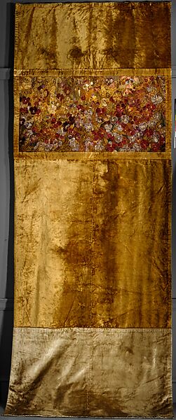 One contemporary article described this portiere: "'The Pansy Bed' by Mrs. T. H. Wheeler, is a good example of distinctly original work both in design, color, and method. The effect is of a pansy bed in its greatest luxuriance of color, and shows how far towards realism and picturesqueness decorative work can be safely carried." The portiere has "A A" embroidered on one of the velvet panels, and "A A" is woven into the selvage of the gold silk-damask lining, which is patterned with interlacing columbines.