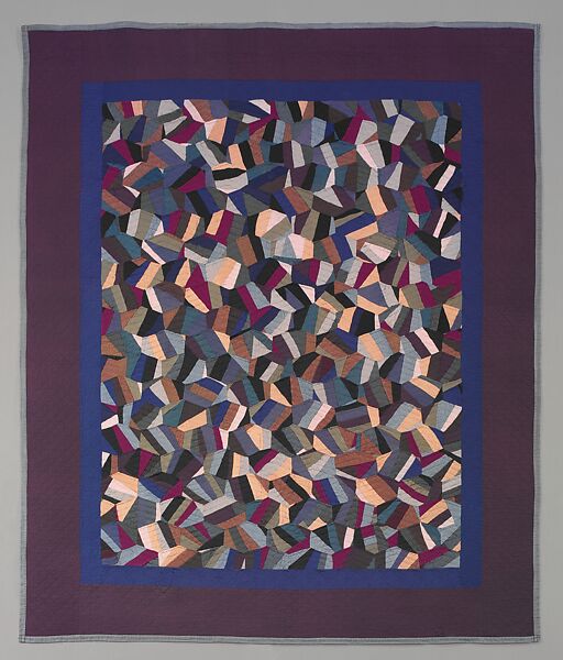 The Amish community in Arthur, Illinois, has been stable and prosperous since its beginnings in 1865, when Amish people from communities farther east moved west to Illinois in search of open land to farm. This piece reflects the influence of the quilting traditions of the Pennsylvania Amish since it is pieced of richly colored wools of the type they favor. But because the religious strictures of the Arthur community are somewhat more relaxed than those in Pennsylvania, Arthur quiltmakers are allowed a greater degree of creativity in their designs. The Arthur Amish are especially known for a group of rather eccentric quilts from the early twentieth century based on crazy patterns, such as this example.