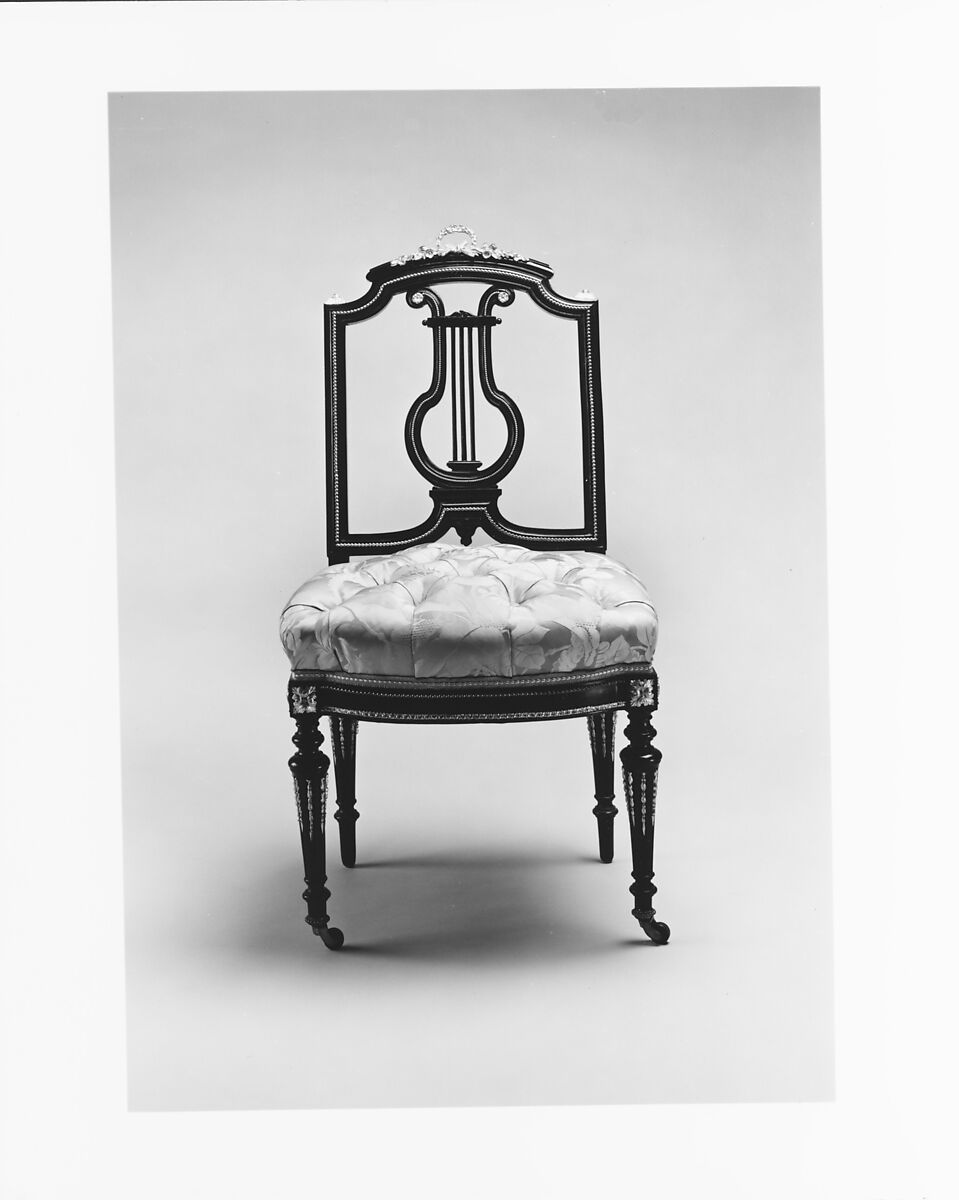 This side chair is part of a suite of Louis XVI–style furniture that John Taylor Johnston (1820–1893) purchased from the firm of Ringuet-Leprince and L. Marcotte in about 1856. This international firm had showrooms in both Paris and New York, and it is believed that at least some of the pieces of the suite were made in Paris for the New York commission. Johnston, a railroad executive and the first president of The Metropolitan Museum of Art, used the furniture in the music room of his residence at 8 Fifth Avenue. The suite (68.69.1–68.69.11, 68.165.1–68.165.6) includes two sofas, two armchairs, a table, two matching cabinets, a third large cabinet, six matching side chairs, a pair of lyre-back side chairs, and a firescreen. After Ringuet-Leprince retired in 1860, the firm became known as L. Marcotte and Company. Léon Marcotte was New York's most noted cabinetmaker and interior decorator during the 1860s.