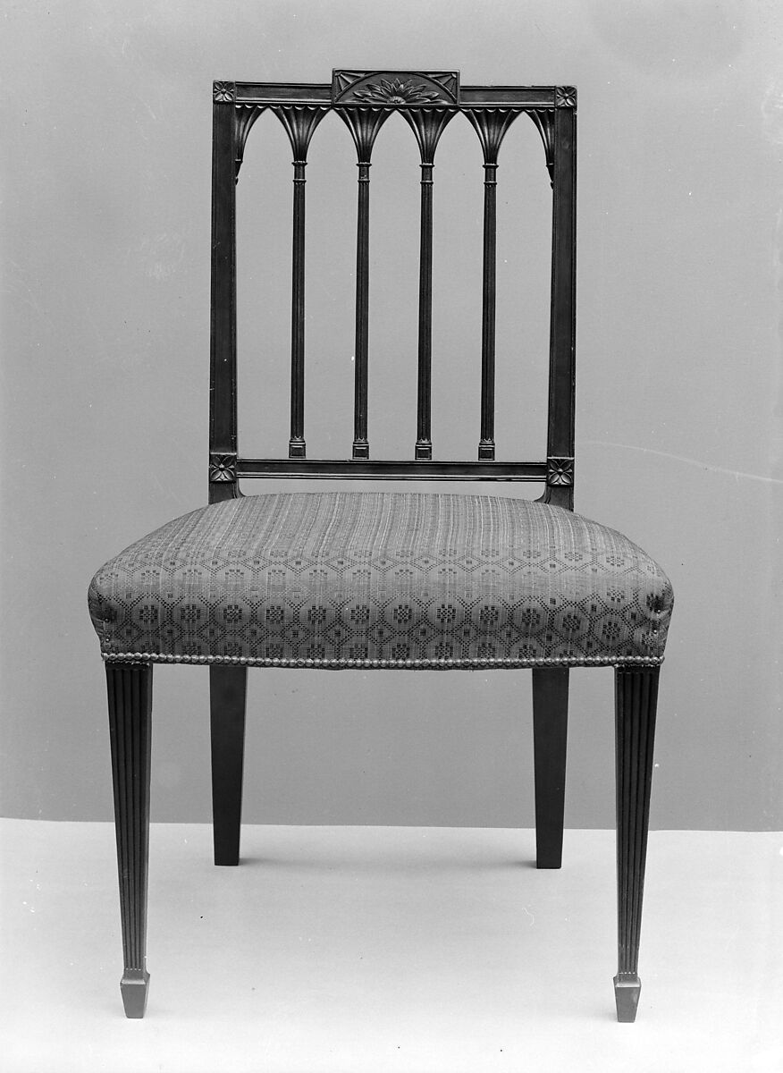 This chair and its mate were originally part of a set of six. The attribution for these chairs to Slover and Taylor of New York is based on a similar chair bearing that firm's label. This chair, its mate, and four others have a history of ownership in the Franklin House (home of President Washington) in Chateaugay, New York.