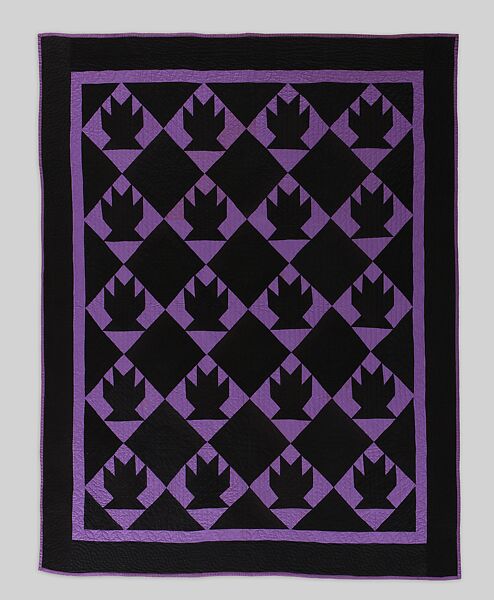 This black and purple quilt has a pieced-block design. The Basket blocks are set on point, four across and five down, and alternate with plain black diamond-shaped blocks. A narrow purple inner border is surrounded by a wide black outer border. The edge binding is a purple cotton and the backing is gray cotton. There is a layer of cotton batting. The black blocks are quilted with sunflowers, and the pieced blocks are quilted with parallel straight lines. The purple inner border features pairs of petals or seeds, and the outer border is quilted with a rope pattern. The quilt is stitched together by machine but is hand quilted with black cotton thread.
