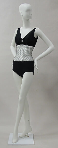 In 1964, Cole of California introduced the “Scandal” bathing suit line, named for its provocative exposure of the body through panels of nylon mesh. Margit Fellegi designed the suits using a process she developed for shirring cotton on elastic thread. According to Fellegi, the innovative fabric provided the figure control and fit of a girdle. This suit from the “Scandal” collection, named the “Outrageous,” features a bra top and hipster brief joined by a black mesh insert at the midriff. The style allowed the wearer to experiment with less coverage without sacrificing support.
