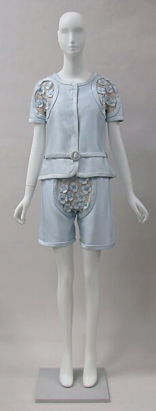 In 1965, Courreges stopped presenting collections in response to the proliferation of copies on the market. He returned to the runway in spring 1967 with designs that were more decorative and less angular. This short suit of powder blue duchesse silk from his fall 1967 collection features sheer net panels embroidered with white flowers at the front and back of the shorts and beneath each arm. Styled with pigtails, white gloves, and knee socks for a Courrèges promotional film, the look combines a naïve aesthetic with provocative display.