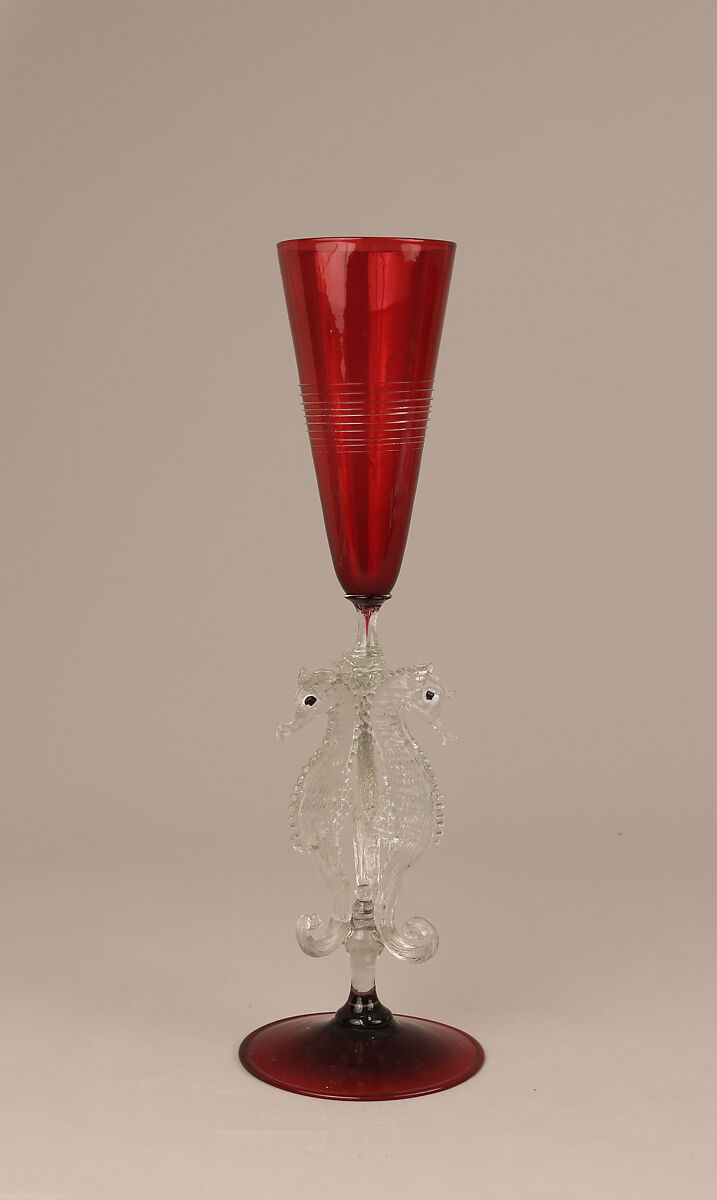 Along with establishing a company that specialized in colorful glass mosaics for architecture, Salviati opened a workshop for blown glass that gained renown for the fanciful creatures incorporated into varied designs. Seahorses, stallions, dragons, and other exotic creatures formed the stems of cups, bows and candlesticks.