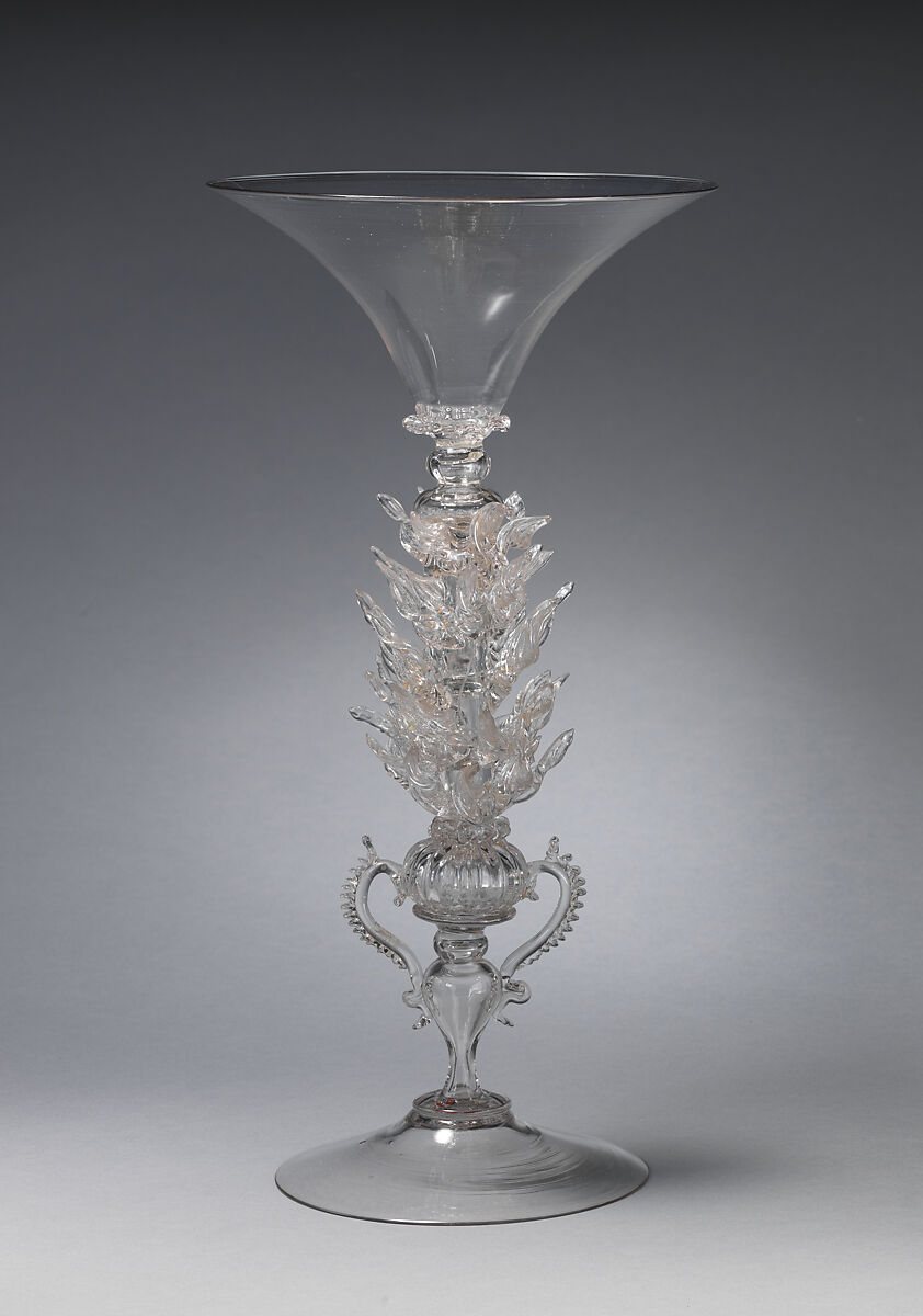 During the Renaissance, Venetian glassmakers, working on the island of Murano, were celebrated across Europe for their fine and sparkling work. Called “cristallo” emulating the clarity of rock crystal, in the hands of the most skilled glassblowers the medium could be delightfully manipulated, variously stretched paper-thin flat, or playfully twisted, or blown into molds with spectacular patterns.