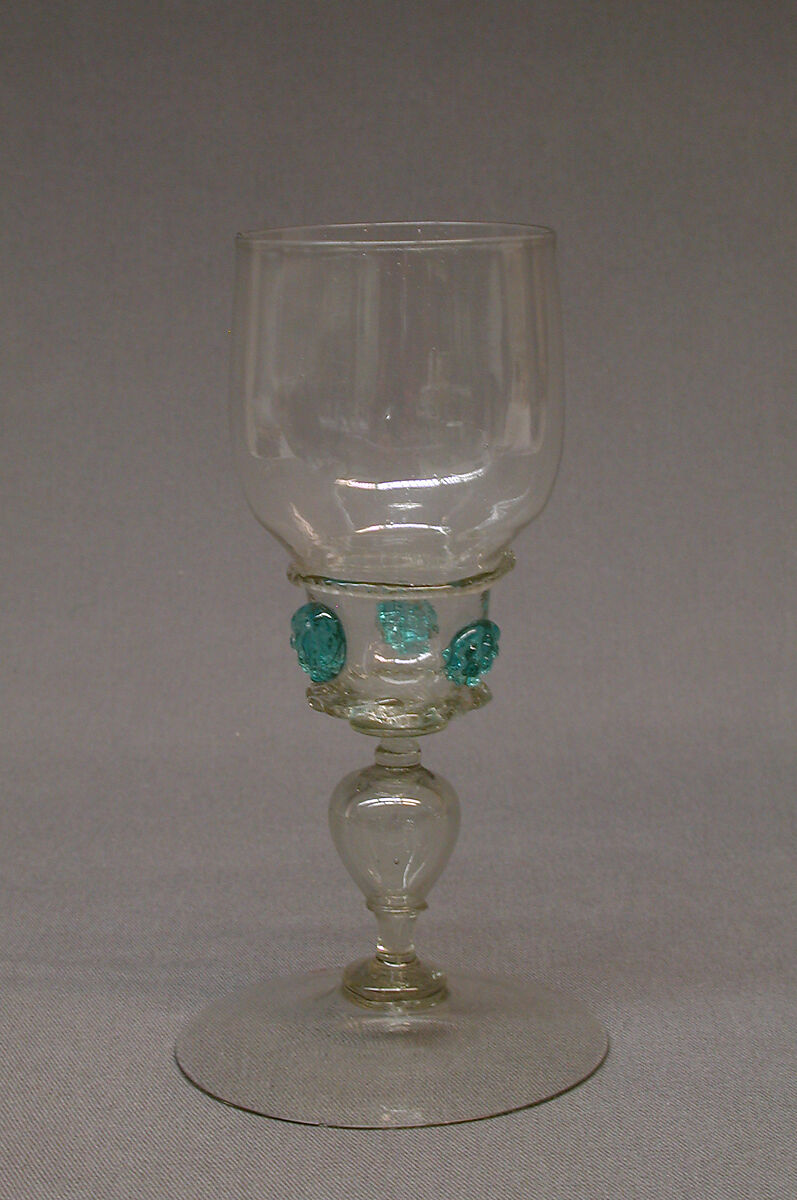 The form of this goblet has a roemer-shaped bowl attached to a Venetian 17th century-type foot and stem.