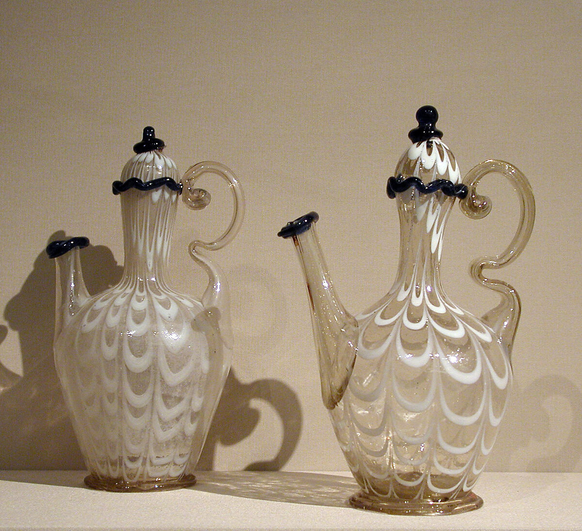 These typically Catalan vessels (see also 83.7.10) display the loopy handles and latticinio technique, with its combed opaque white stripes, derived from Venetian prototypes.