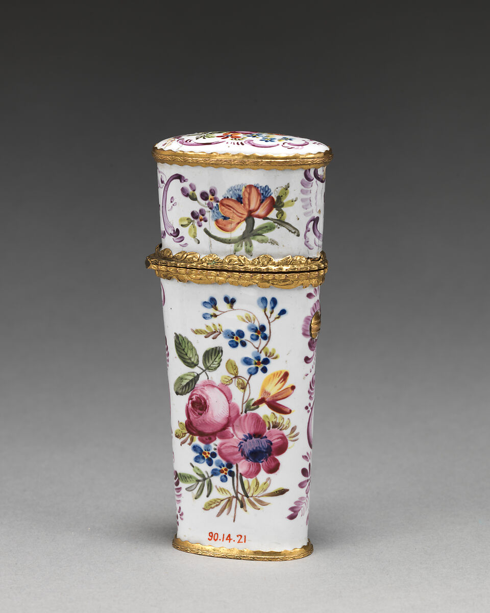 Enameled objects like this one, intended to imitate the lustrous quality of porcelain, were among the more affordable goods sold at toyshops across London and in fashionable English resort towns. Though often called "Battersea enamels" in common parlance (referring to the manufactory at York House, Battersea, operating only between 1753 and 1756), we rarely know exactly where individual pieces were made. The main centers of enamel production were in London, South Staffordshire (particularly in Bilston and Wednesbury), and Birmingham.