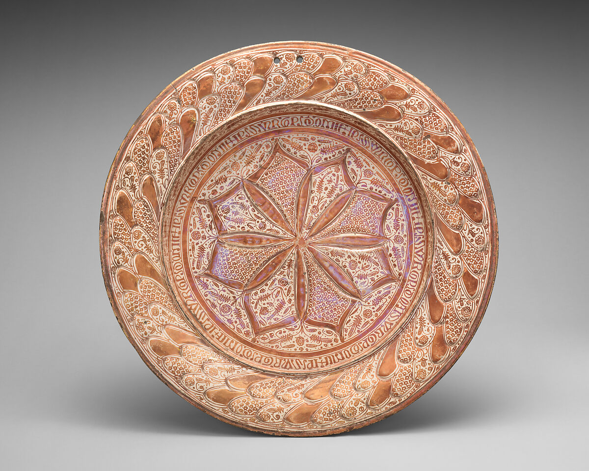 Tin-glazed earthenware, of which lusterware is one type, was developed in the Middle East in the ninth and tenth centuries to imitate the porcelains produced in China. The opaque white glaze concealed the clay body, which could range from pale buff to brick red, allowing for brilliant effects created by painting the white surface with metal oxides that fired to a range of colors. This technique, as well as the use of metallic luster—an iridescent, coppery painted glaze—spread throughout the Muslim world, arriving among the potters of Valencia in the thirteenth century. The so-called Hispano-Moresque lusterware, with its fusion of Islamic and Gothic styles and motifs, often in shaped imitating those of metal vessels, was treasured by the elite in Spain during the fifteenth century and exported to the courts of Europe. The Valencian industry declined in the late sixteenth century, as colorful Italian Renaissance maiolica gained in popularity among the fashionable and as Spanish centers were founded to produce versions of its pictorial forms. Adding to this decline was the expulsion from Valencia in 1609 of all the remaining Moriscos (Muslims converted to Christianity), though Christian potters reestablished the industry shortly thereafter.