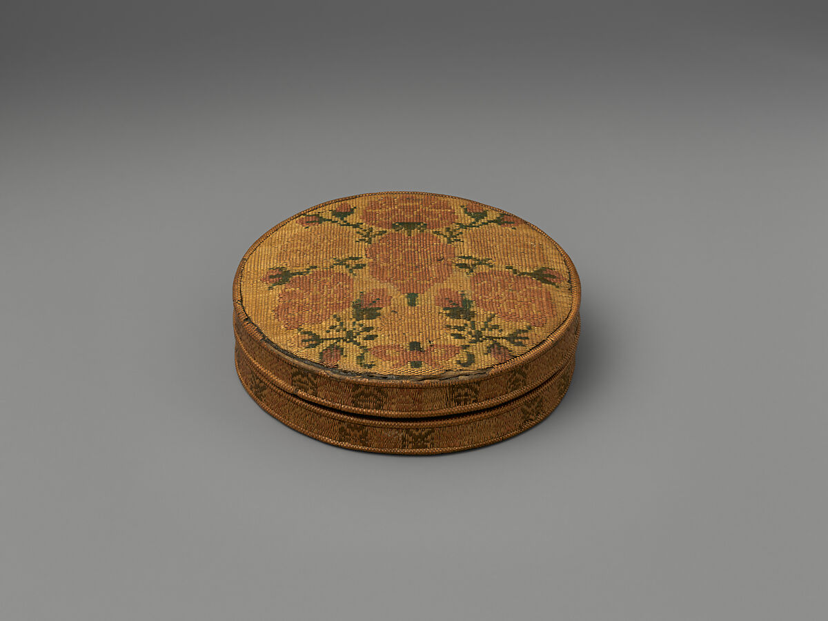 A weaving technique using straw was used to created the symmetrical pattern of rose branches on the lid of this small box that may have served as a bonbonnière.