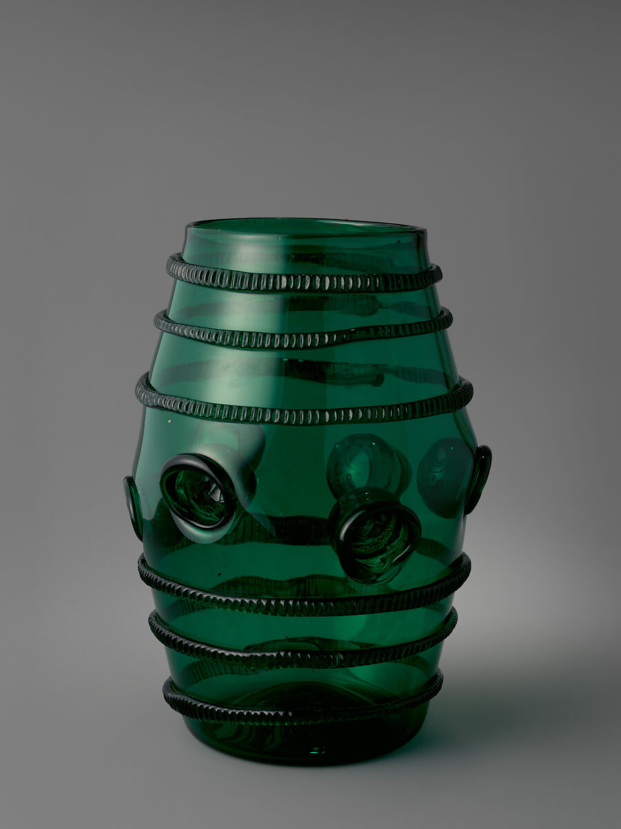 The distinctive color and surface details of this vessel are characteristic of the centuries-long tradition of Waldglas (forest glass), so called because small Central European glasshouses were often located in the forest, near plentiful sources of fuel. Forest glass is typically green with raised blobs, or prunts, which make for a better grip. By contrast, this large cup has circular indentations that allow fingers—usually thumbs—to be inserted. It can then be safely lifted, even when filled with beer.