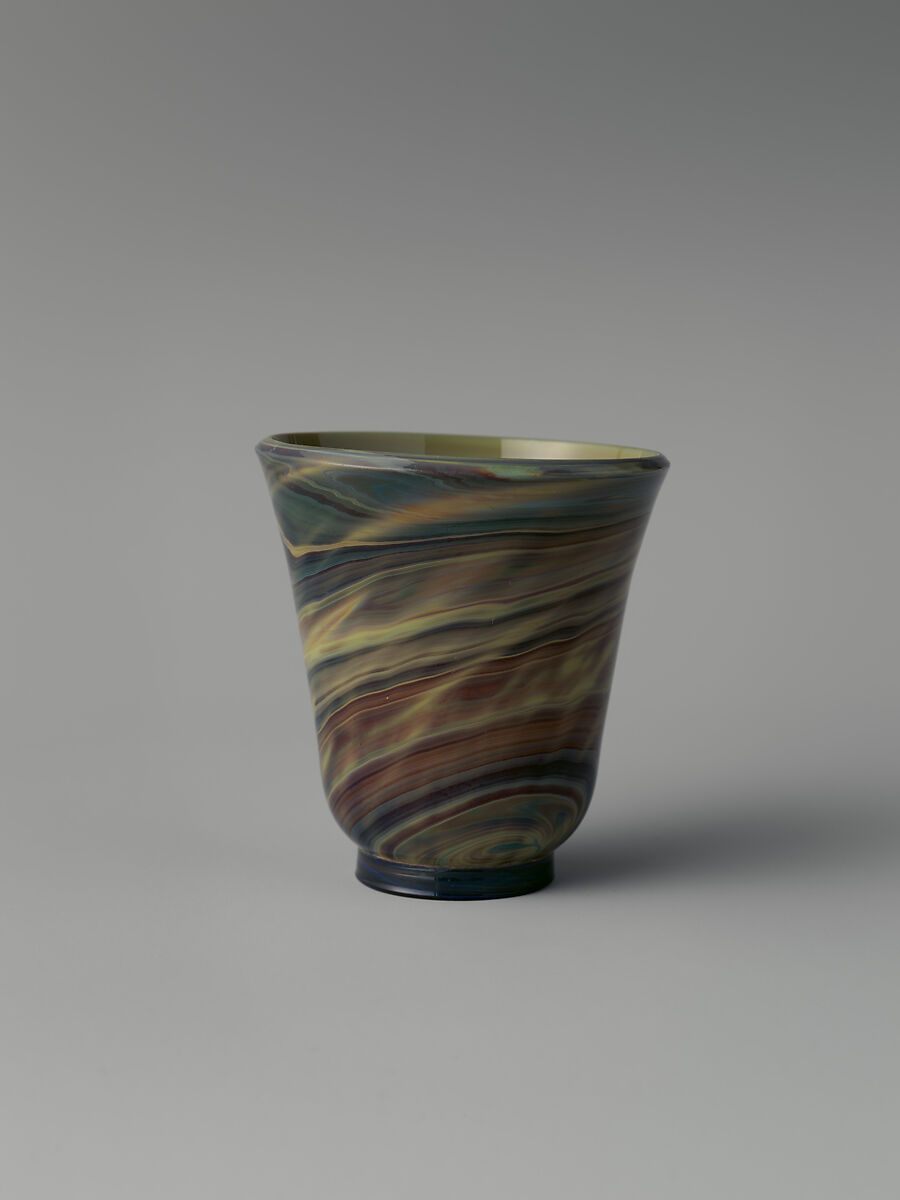 The “chalcedony” glass of these delicate objects mimics the banded, multicolored agate stone of the same name. The technique involves the addition of several metallic oxides into a glass batch that is intentionally left poorly mixed, resulting in streaky veins of color.