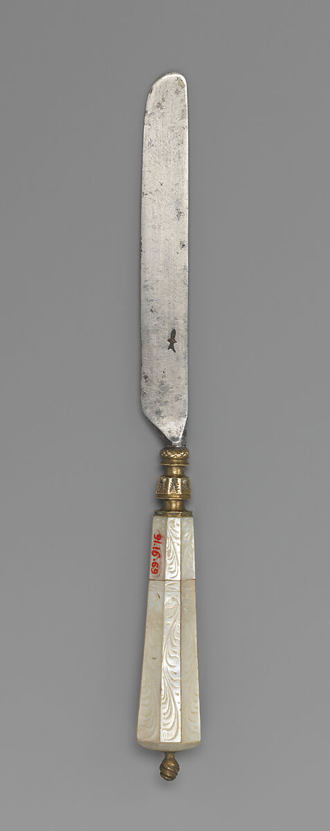 With their octagonally-shaped wooden handles covered by mother-of-pearl scales engraved with scrolling foliage, these implements are referred to as “Habaner” work, a term used for art made by descendants of refugees who had settled in Hungary during the sixteenth century fleeing from religious persecution in the Austrian province of Tyrol.