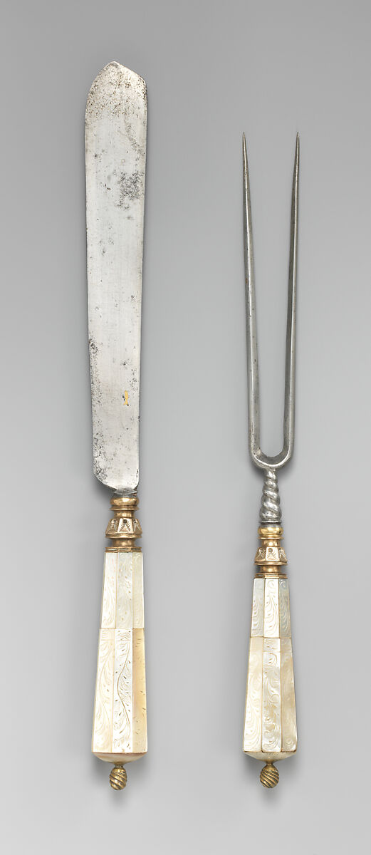 With their octagonally-shaped wooden handles covered by mother-of-pearl scales engraved with scrolling foliage, these implements are referred to as “Habaner” work, a term used for art made by descendants of refugees who had settled in Hungary during the sixteenth century fleeing from religious persecution in the Austrian province of Tyrol.