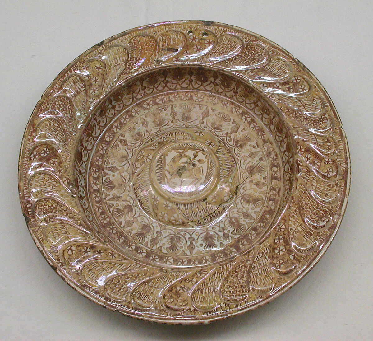 Tin-glazed earthenware, of which lusterware is one type, was developed in the Middle East in the ninth and tenth centuries to imitate the porcelains produced in China. The opaque white glaze concealed the clay body, which could range from pale buff to brick red, allowing for brilliant effects created by painting the white surface with metal oxides that fired to a range of colors. This technique, as well as the use of metallic luster—an iridescent, coppery painted glaze—spread throughout the Muslim world, arriving among the potters of Valencia in the thirteenth century. The so-called Hispano-Moresque lusterware, with its fusion of Islamic and Gothic styles and motifs, often in shaped imitating those of metal vessels, was treasured by the elite in Spain during the fifteenth century and exported to the courts of Europe. The Valencian industry declined in the late sixteenth century, as colorful Italian Renaissance maiolica gained in popularity among the fashionable and as Spanish centers were founded to produce versions of its pictorial forms. Adding to this decline was the expulsion from Valencia in 1609 of all the remaining Moriscos (Muslims converted to Christianity), though Christian potters reestablished the industry shortly thereafter.