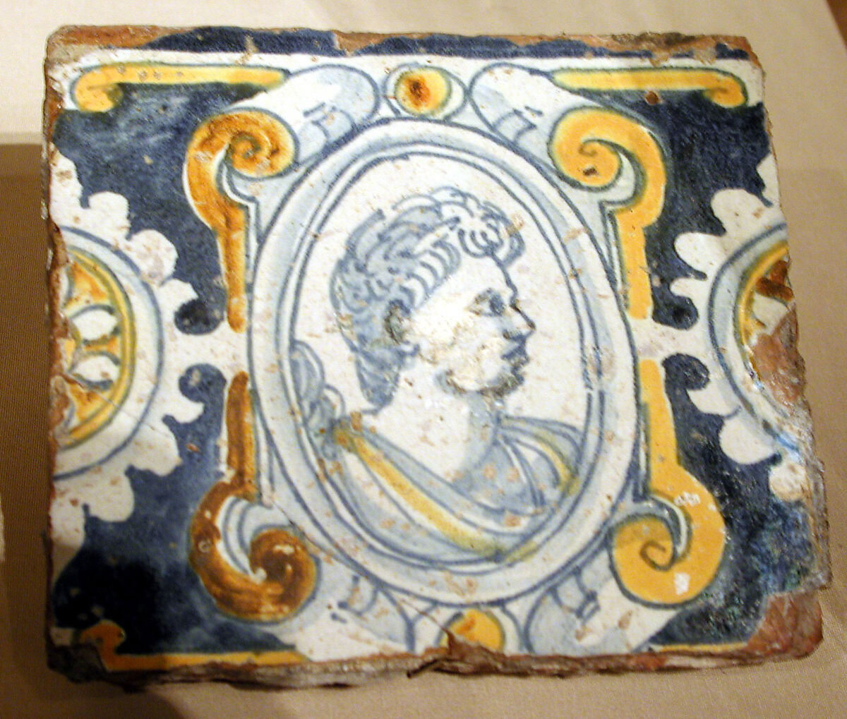 In the early sixteenth century, the Italian artist Niculoso Pisano introduced in Seville the flat, pictorial style that enabled tile makers employing enamel colors to produce more painterly images, such as the decoration on this wall tile. Strapwork cartouches in the Flemish manner surround the head, which probably represents a Roman emperor.
