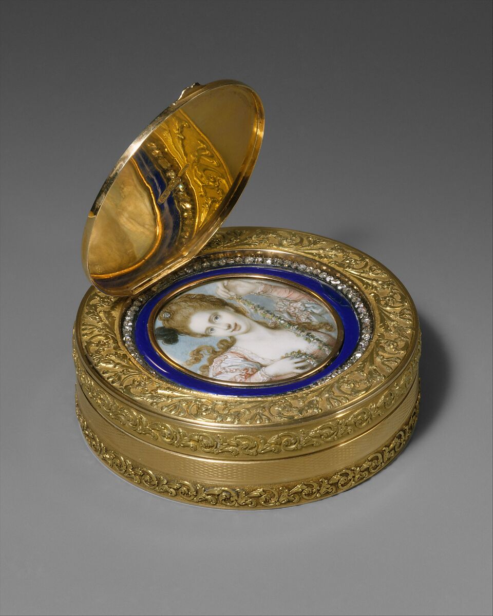Inserted in the lid of the box, and with its hinged cover, is a portrait on ivory of the concert singer Sarah Harrop Bates (1755-1811) as Flora in about her twentieth year by the miniaturist Richard Cosway (1742-1821).