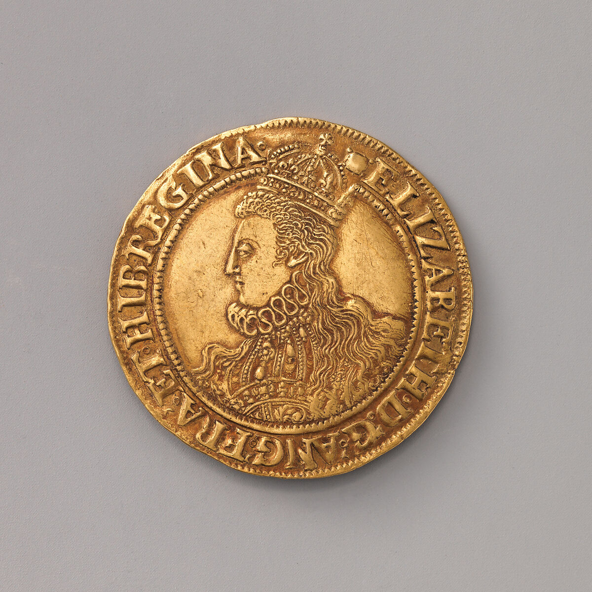 The supplies of bullion brought to Europe from the New World in the sixteenth and seventeenth centuries caused inflation, and in response new coinage was issued with a wider range of denominations. Gold coins like the sovereign, with the value of one pound, twenty shillings, first appeared in 1489. It was replaced by the unite in 1604 and by the guinea in 1663. Initially minted in gold, the crown was also produced in silver from 1551, with standardized dimensions similar to other European coins. The design shows Elizabeth I (r. 1558–1603). The sovereign was the forerunner of the English pound.