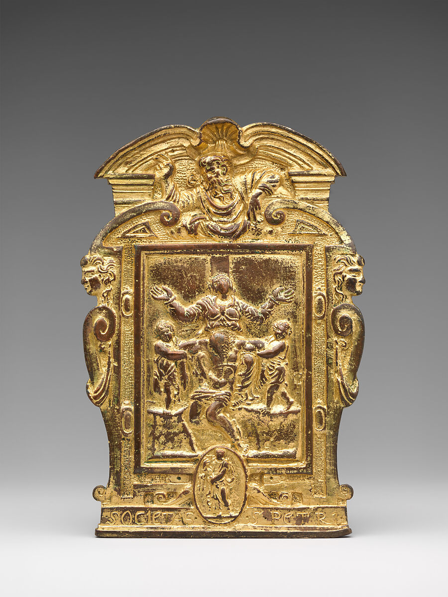 The Pietà Michelangelo invented for Vittoria attracted an unusual, ongoing fame, to the point that it became a cult image widely copied and repurposed in different materials. Beyond the numerous copies in drawings, paintings, and engravings, the design was adapted for portable altarpieces, votive reliefs, and paxes—small tablets kissed by the participants in Mass—such as this one. The pax, its gilding quite worn, is crudely inscribed with the name of a religious society of Saint Peter.