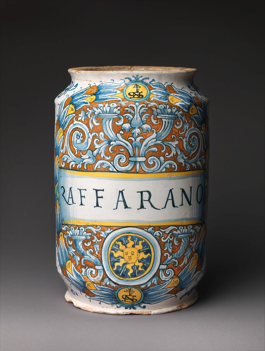 Storage vessels were among the most frequently produced maiolica wares in late medieval and Renaissance Italy. Made in fairly standard shapes, they were designed to fit with dozens of others on a shelf, often in a pharmacy or shop. Their handles therefore tend to fit within the vessel’s profile, and the cylindrical albarello type is generally narrower at the middle than at the top or bottom, making it easy to grip. Other common features include inscriptions indicating contents and flanged lips to help secure cloth or paper seals. The decoration, usually more elaborate on one side than the other, can sometimes link pieces to a known dispensary or specific workshop or artist.